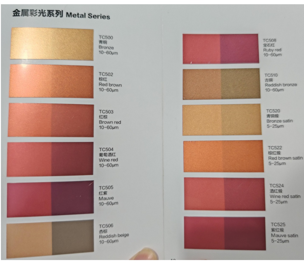 Seri logam dilapisi metana pada permukaan mika. Dengan mengontrol ketebalan lapisan oksida besi secara presisi, serangkaian warna perunggu, cokelat kemerahan, merah anggur, ungu, merah, hijau, dan kopi muncul secara berurutan. Warna dan kromatogramnya lengkap, metalik kuat, dan memiliki daya tutup yang kuat, warna yang kaya, serta sifat fisik dan kimia.